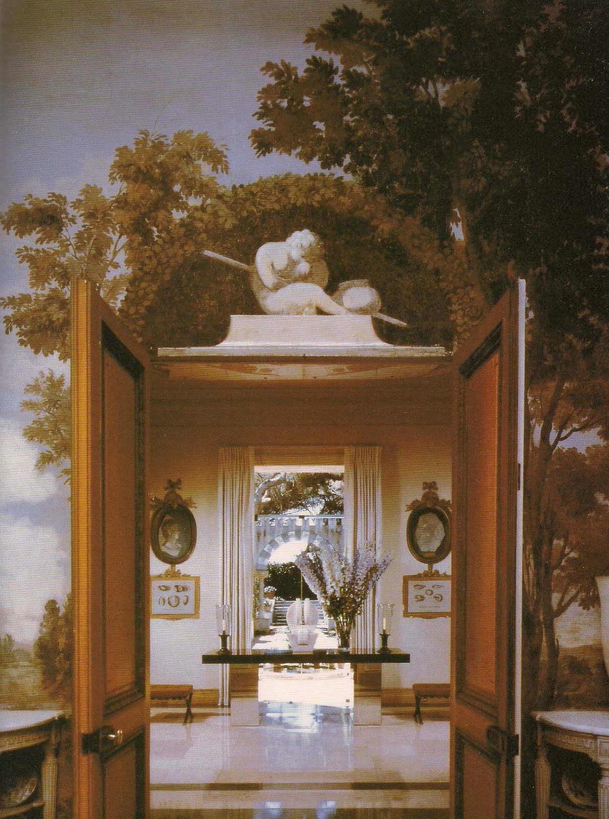 | From Les Resussites de la Decoration Francaise 1950-60, Mr. Worthington tells us that the murals in this room date from the 18th century, but note the curtain in the center of this photo painted to match the mural. Lady Kenmare was once a scenic painter in Hollywood, and it is said that she painted the curtain, herself. Also of note is the sisal rug; Rory Cameron is often credited as introducing this humble material, formerly reserved for wet areas (such as around a swimming pool), for use in combination with fine furnishings. |